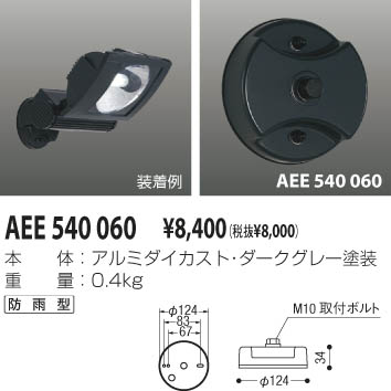 本体:アルミダイカスト・ダークグレー塗装|●幅-φ124 出幅-34mm 重-0.4kg|●適合器具 AUN940356〜7・AUN940751〜2・AUN940822〜9・AUN940830〜5