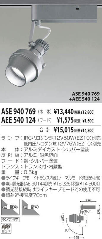 白75W|ランプ:IRCハロゲン球12V50W(EZ10)別売 低内圧ハロゲン球12V75W(EZ10)別売|本体:アルミダイカスト・シルバー塗装|反射板:アルミ・銀色鏡面|トランス:トランス付・内蔵型|●高-128 本体長-108 本体幅-φ88mm 重-0.4kg|●ライフキープモードトランス内蔵(ノーマルモード時調光可能)|●専用調光器〔AE-90144別売 ¥15225(税抜¥14500)〕|●調光器接続時はライフキープモードでの使用不可|●照射近接限度70cm