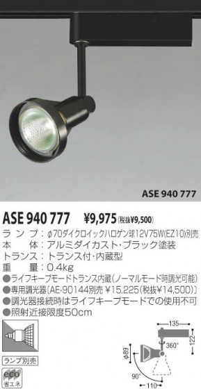 白75W|ランプ:φ70ダイクロイックハロゲン球12V75W(EZ10)別売|本体:アルミダイカスト・ブラック塗装|トランス:トランス付・内蔵型|●高-122 本体長-110 本体幅-φ89mm 重-0.4kg|●ライフキープモードトランス内蔵(ノーマルモード時調光可能)|●専用調光器〔AE-90144別売 ¥15225(税抜¥14500)〕|●調光器接続時はライフキープモードでの使用不可|●照射近接限度50cm