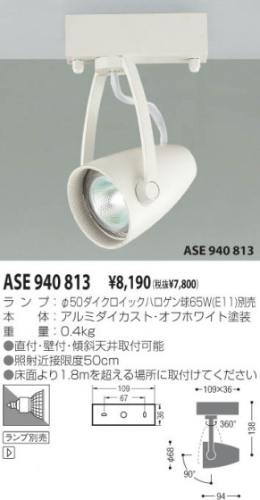 白65W|ランプ:φ50ダイクロイックハロゲン球65W(E11)別売|本体:アルミダイカスト・オフホワイト塗装|●高-138 本体長-94 本体幅-φ68mm 重-0.4kg|●直付・壁付・傾斜天井取付可能|●照射近接限度50cm|●床面より1.8mを超える場所に取付けてください