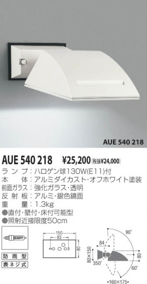 白130W|ランプ:ハロゲン球130W(E11)付|本体:アルミダイカスト・オフホワイト塗装|前面ガラス:強化ガラス・透明|反射板:アルミ・銀色鏡面|●高-80 本体幅-160×175mm 重-1.3kg|●直付・壁付・床付可能型|●照射近接限度50cm