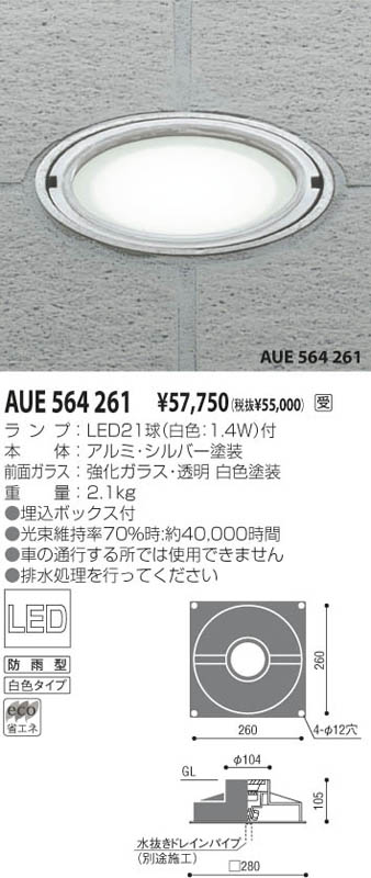 LED1.4W|ランプ:LED21球(白色:1.4W)付|本体:アルミ・シルバー塗装|前面ガラス:強化ガラス・透明 白色塗装|●幅-□280 埋込深-105mm 重-2.1kg|●埋込ボックス付|●光束維持率70%時:約40000時間|●車の通行する所では使用できません|●排水処理を行ってください