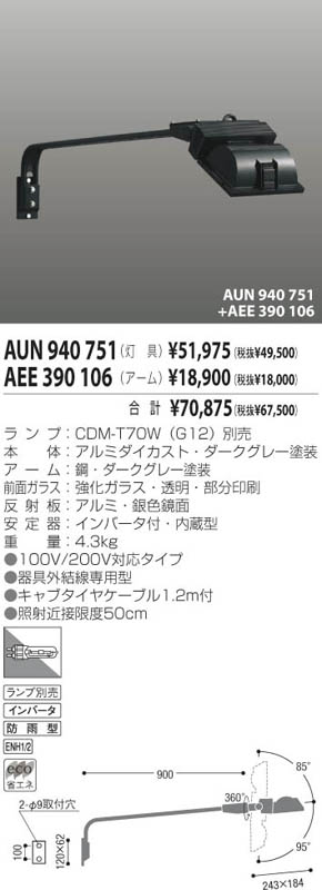 H70W|ランプ:CDM-T70W(G12)別売|本体:アルミダイカスト・ダークグレー塗装|前面ガラス:強化ガラス・透明部分印刷|反射板:アルミ・銀色鏡面|安定器:インバータ付・内蔵型|●高-243 本体幅-184×68mm 重-2.0kg|●100V/200V対応タイプ|●器具外結線専用型|●キャブタイヤケーブル1.2m付|●照射近接限度50cm