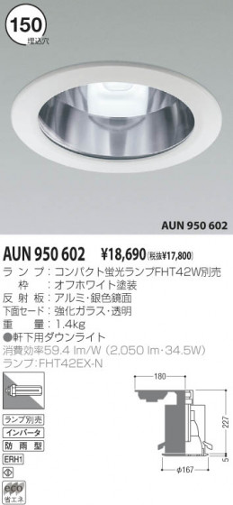 蛍42W|ランプ:コンパクト蛍光ランプFHT42W別売|枠:オフホワイト塗装|反射板:アルミ・銀色鏡面|下面セード:強化ガラス・透明|●幅-φ167 出幅-5 埋込高-227mm 重-1.4kg|●軒下用ダウンライト|消費効率59.4 lm/W (2050 lm・34.5W)|ランプ:FHT42EX-N