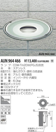 H20W|ランプ:CDM-Tm20W(PGJ5)別売|本体:ステンレス|前面ガラス:強化ガラス・透明 白色塗装|反射板:アルミ・銀色鏡面|安定器:インバータ付・内蔵型|●幅-φ165 埋込深-325mm 重-6.0kg|●埋込ボックス付|●100Vタイプ|●車の通行する所では使用できません|●排水処理を行ってください