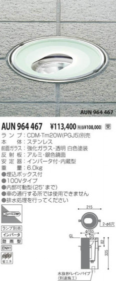 H20W|ランプ:CDM-Tm20W(PGJ5)別売|本体:ステンレス|前面ガラス:強化ガラス・透明 白色塗装|反射板:アルミ・銀色鏡面|安定器:インバータ付・内蔵型|●幅-φ165 埋込深-325mm 重-6.0kg|●埋込ボックス付|●100Vタイプ|●内部可動型(25°まで)|●車の通行する所では使用できません|●排水処理を行ってください