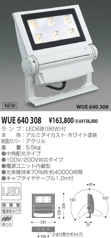 LED96.0W|ランプ:LED6球(96W)付|本体:アルミダイカスト・ホワイト塗装|前面カバー:アクリル|●高-308 本体長-82 幅-293×82mm 重-5.5kg|●中角配光タイプ|●100V/200V対応タイプ|●電源ユニット内蔵型|●光束維持率70%時:約40000時間|●キャブタイヤケーブル1.2m付
