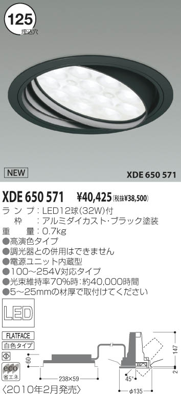 LED32.0W|ランプ:LED12球(32W)付|枠:アルミダイカスト・ブラック塗装|●幅-φ135 出幅-2 埋込穴径-φ125 埋込高-147 埋込必要高-147mm 重-0.7kg|●高演色タイプ|●調光器との併用はできません|●電源ユニット内蔵型|●100〜254V対応タイプ|●光束維持率70%時:約40000時間|●5〜25mmの材厚で取付けてください