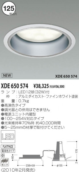 LED32.0W|ランプ:LED12球(32W)付|枠:アルミダイカスト・ファインホワイト塗装|●幅-φ135 出幅-2 埋込穴径-φ125 埋込高-176 埋込必要高-176mm 重-0.7kg|●高演色タイプ|●調光器との併用はできません|●電源ユニット内蔵型|●100〜254V対応タイプ|●光束維持率70%時:約40000時間|●5〜25mmの材厚で取付けてください