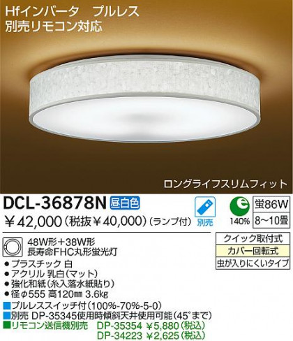 機能/他:■プルレススイッチ付(100%-70%-5-0)|■別売 DP-35345使用時傾斜天井使用可能(45°まで)|■リモコン送信機別売 DP-35354 ¥5,880(税込) DP-34223 ¥2,625(税込)|Hfインバータ プルレス|別売リモコン対応|ロングライフスリムフィット