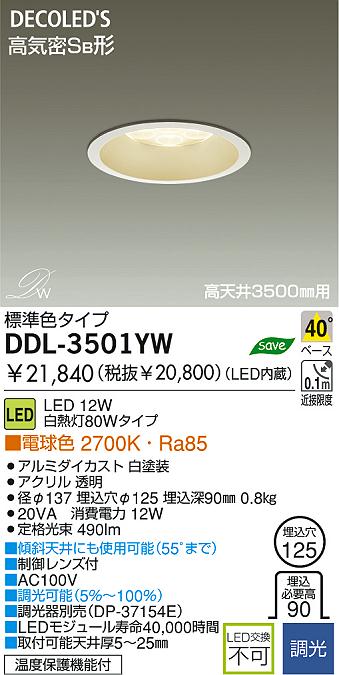 機能/他:■傾斜天井にも使用可能(55°まで)|■制御レンズ付|■AC100V|■調光可能(5%〜100%)|■調光器別売(DP-37154)|■埋込必要高90mm|■取付可能天井厚5〜25mm|白熱灯80Wタイプ|DECOLED’S|高気密SB形|高天井3500mm用|DW|SAVE
