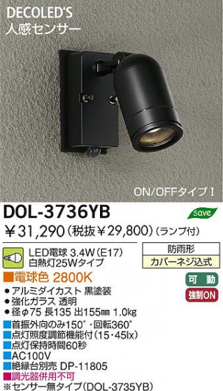 機能/他:■首振外向のみ150°・回転360°|■点灯照度調節機能付(15・45lx)|■点灯保持時間60秒|■AC100V|■絶縁台別売 DP-11805|■調光器併用不可|白熱灯25Wタイプ|DECOLED’S|人感センサー|ON/OFFタイプI|SAVE