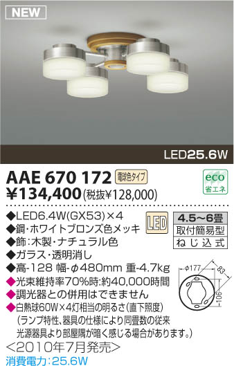 LED25.6W|◆LED6.4W(GX53)×4|◆本体:鋼・ホワイトブロンズ色メッキ|◆飾:木製・ナチュラル色|◆グローブ:ガラス・透明消し|◆高-128 幅-φ480mm 重-4.7kg|◆光束維持率70%時:約40,000時間|◆調光器との併用はできません|◆白熱球60W×4灯相当の明るさ(直下照度)(ランプ特性、器具の仕様により同畳数の従来光源器具より部屋隅が暗く感じる場合があります。)|消費電力:25.6W