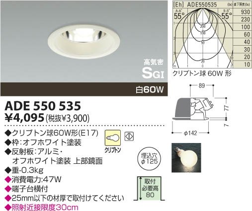 白60W|◆クリプトン球60W形(E17)|◆枠:オフホワイト塗装|◆反射板:アルミ・オフホワイト塗装 上部鏡面|◆幅-φ142 出幅-7 埋込穴径-φ125 埋込高-77 取付必要高-80mm 重-0.3kg|◆端子台横付|◆25mm以下の材厚で取付けてください|◆照射近接限度30cm|消費電力:47W