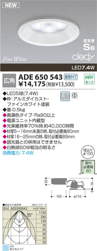 LED7.4W|◆LED5球(7.4W)|◆枠:アルミダイカスト・ファインホワイト塗装|◆幅-φ110 出幅-4 埋込穴径-φ100 埋込高-76 取付必要高-80mm 重-0.5kg|◆高演色タイプ・Ra90以上|◆電源ユニット内蔵型|◆光束維持率70%時:約40,000時間|◆材厚5〜16mm未満の時、取付必要高80mm|◆材厚16〜25mmの時、取付必要高89mm|◆調光器との併用はできません|◆白熱球60W相当の明るさ|消費電力:7.4W