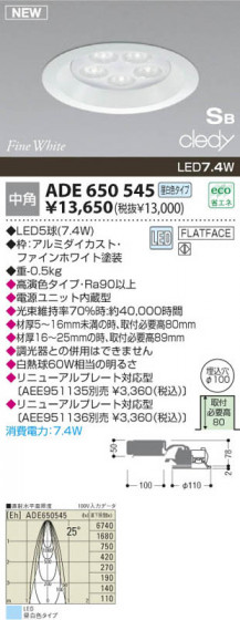 LED7.4W|◆LED5球(7.4W)|◆枠:アルミダイカスト・ファインホワイト塗装|◆幅-φ110 出幅-2 埋込穴径-φ100 埋込高-78 取付必要高-80mm 重-0.5kg|◆高演色タイプ・Ra90以上|◆電源ユニット内蔵型|◆光束維持率70%時:約40,000時間|◆材厚5〜16mm未満の時、取付必要高80mm|◆材厚16〜25mmの時、取付必要高89mm|◆調光器との併用はできません|◆白熱球60W相当の明るさ|◆リニューアルプレート対応型〔AEE951135別売 ¥3,360(税込)〕|◆リニューアルプレート対応型〔AEE951136別売 ¥3,360(税込)〕|消費電力:7.4W