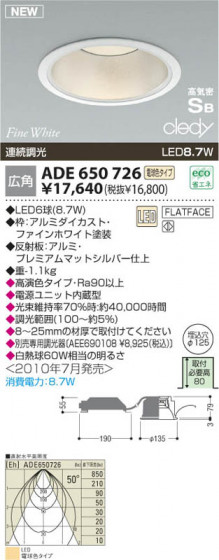 LED8.7W|◆LED6球(8.7W)|◆枠:アルミダイカスト・ファインホワイト塗装|◆反射板:アルミ・プレミアムマットシルバー仕上|◆幅-φ135 出幅-3 埋込穴径-φ125 埋込高-79 取付必要高-80mm 重-1.1kg|◆高演色タイプ・Ra90以上|◆電源ユニット内蔵型|◆光束維持率70%時:約40,000時間|◆調光範囲(100〜約5%)|◆8〜25mmの材厚で取付けてください|◆別売専用調光器〔AEE690108 ¥8,925(税込)〕|◆白熱球60W相当の明るさ|消費電力:8.7W
