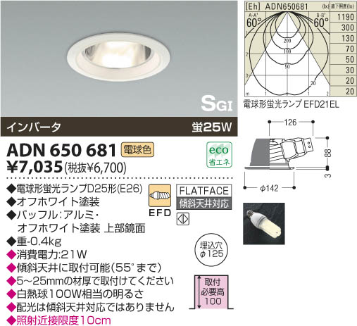 蛍25W|◆電球形蛍光ランプD25形(E26)|◆オフホワイト塗装|◆バッフル:アルミ・オフホワイト塗装 上部鏡面|◆幅-φ142 出幅-3 埋込穴径-φ125 埋込高-88 取付必要高-100mm 重-0.4kg|◆傾斜天井に取付可能(55°まで)|◆5〜25mmの材厚で取付けてください|◆白熱球100W相当の明るさ|◆配光は傾斜天井対応ではありません|◆照射近接限度10cm|消費電力:21W