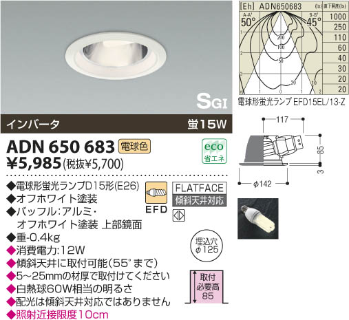 蛍15W|◆電球形蛍光ランプD15形(E26)|◆オフホワイト塗装|◆バッフル:アルミ・オフホワイト塗装 上部鏡面|◆幅-φ142 出幅-3 埋込穴径-φ125 埋込高-85 取付必要高-85mm 重-0.4kg|◆傾斜天井に取付可能(55°まで)|◆5〜25mmの材厚で取付けてください|◆白熱球60W相当の明るさ|◆配光は傾斜天井対応ではありません|◆照射近接限度10cm|消費電力:12W