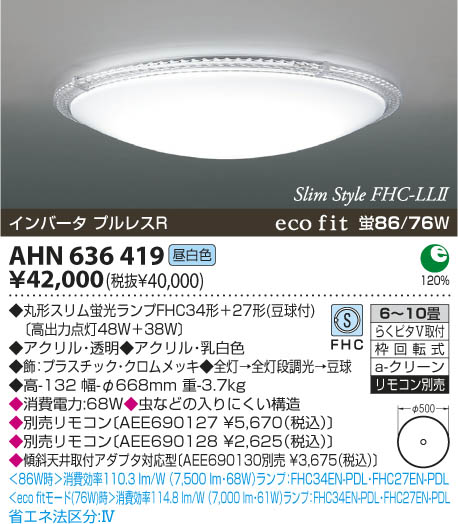 蛍86/76W|◆丸形スリム蛍光ランプFHC34形+27形(豆球付)〔高出力点灯48W+38W〕|◆アクリル・透明|◆アクリル・乳白色|◆飾:プラスチック・クロムメッキ|◆全灯→全灯段調光→豆球|◆高-132 幅-φ668mm 重-3.7kg|◆虫などの入りにくい構造|◆別売リモコン〔AEE690127 ¥5,670(税込)〕|◆別売リモコン〔AEE690128 ¥2,625(税込)〕|◆傾斜天井取付アダプタ対応型〔AEE690130別売 ¥3,675(税込)〕|<86W時>消費効率110.3lm/W (7,500lm・68W)|ランプ:FHC34EN-PDL・FHC27EN-PDL|<eco fitモード(76W)時>消費効率114.8lm/W (7,000lm・61W) ランプ:FHC34EN-PDL・FHC27EN-PDL|省エネ法区分:IV 消費電力:68W