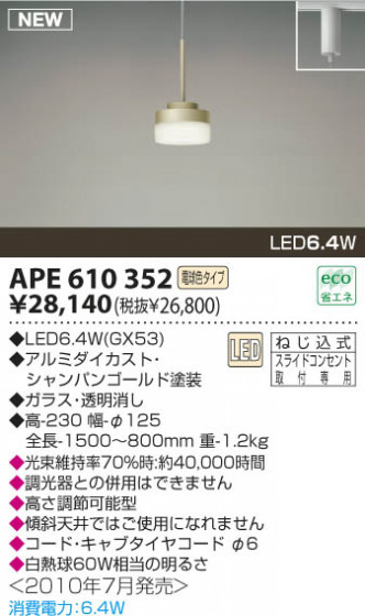 LED6.4W|◆LED6.4W(GX53)|◆本体:アルミダイカスト・シャンパンゴールド塗装|◆グローブ:ガラス・透明消し|◆高-230 幅-φ125 全長-1500〜800mm 重-1.2kg|◆光束維持率70%時:約40,000時間|◆調光器との併用はできません|◆高さ調節可能型|◆傾斜天井ではご使用になれません|◆コード・キャブタイヤコード φ6|◆白熱球60W相当の明るさ|消費電力:6.4W