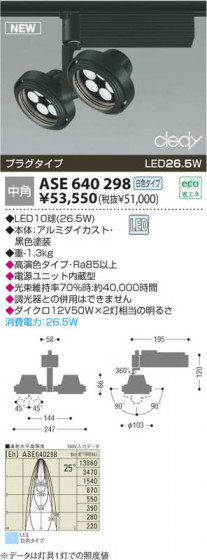 LED26.5W|◆LED10球(26.5W)|◆本体:アルミダイカスト・黒色塗装|◆高-120 本体長-195 幅-247mm 重-1.3kg|◆高演色タイプ・Ra85以上|◆電源ユニット内蔵型|◆光束維持率70%時:約40,000時間|◆調光器との併用はできません|◆ダイクロ12V50W×2灯相当の明るさ|消費電力:26.5W