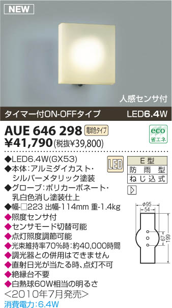 LED6.4W|◆LED6.4W(GX53)|◆本体:アルミダイカスト・シルバーメタリック塗装|◆グローブ:ポリカーボネート・乳白色消し塗装仕上|◆幅-□223 出幅-114mm 重-1.4kg|◆照度センサ付|◆センサモード切替可能|◆点灯照度調節可能|◆光束維持率70%時:約40,000時間|◆調光器との併用はできません|◆白熱球60W相当の明るさ|◆直射日光が当たる時、点灯不可|◆絶縁台不要|消費電力:6.4W