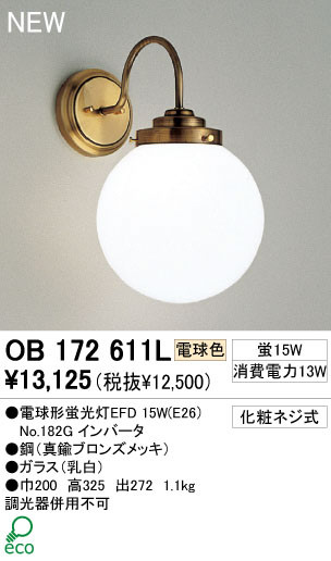 省エネ達成率:119%寸法:巾200 高325 出272 製品重量:1.1Kg 本体材質:●鋼(真鍮ブロンズメッキ)|●ガラス(乳白) ランプ:電球形蛍光灯EFD×1 光源色:電球色