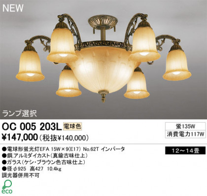 省エネ達成率:100% 畳数:12〜14畳 寸法:径φ925 高427 製品重量:10.4Kg 本体材質:●鋼、アルミダイカスト(真鍮古味仕上)|●ガラス(ケシ・ブラウン色古味仕上) ランプ:電球形蛍光灯EFA×9 光源色:電球色