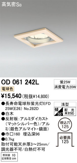 省エネ達成率:100%寸法:径□160 出13 製品重量:0.7Kg 本体材質:●白木|●反射板:アルミダイカスト(マットシルバー色塗装)/アルミ(銀色アルマイト・鏡面) ランプ:長寿命電球形蛍光灯EFD×1 光源色:電球色