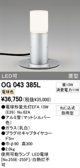 寸法:径φ90 高300 製品重量:2Kg 本体材質:●アルミ管(マットシルバー色塗装)|●ガラス(乳白) ランプ:長寿命電球形蛍光灯EFA×1 光源色:電球色