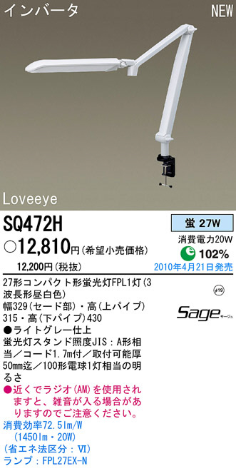 寸法:幅329(セード部)(上パイプ)315・高(下パイプ)430 本体材質・仕上・色:ライトグレー仕上 昼白色
