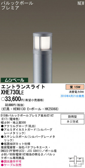 寸法:幅φ84・地上高500 本体材質・仕上・色:アクリルグローブ(乳白)・アルミダイカストガード(シルバーグレーメタリック)・ステンレスポール(シルバーグレーメタリック)・低誘虫UVカット仕様 電球色