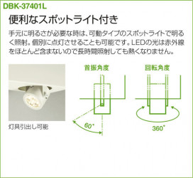 機能/他:■スイッチ付(点滅)|■首振片側のみ60°・回転360°|■拡散パネル付|■AC100V|■LEDモジュール寿命40,000時間|■調光器併用不可|Ra85|消費電力 69W|インバータ|DW|SAVE