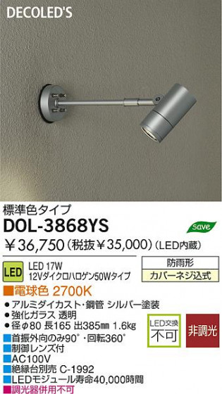 機能/他:■首振外向のみ90°・回転360°|■制御レンズ付|■AC100V|■絶縁台別売 C-1992|■LEDモジュール寿命40,000時間|■調光器併用不可|Ra83|12Vダイクロハロゲン50Wタイプ|標準色タイプ|DECOLED’S|SAVE