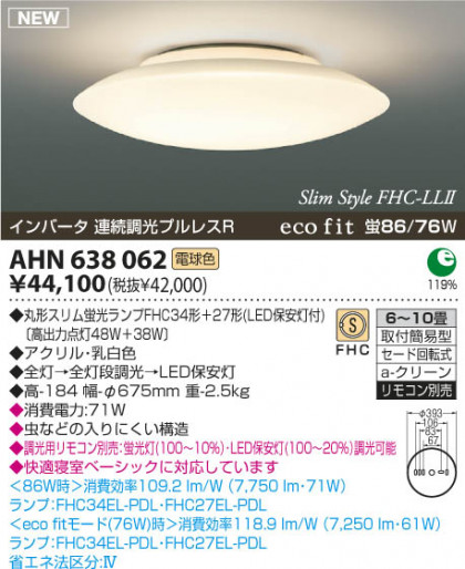 <eco fitモード(76W)時>消費効率118.9 lm/W (7250 lm・61W)
