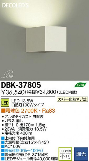 機能/他:■上向付・下向付兼用|■光源可動(左右15°外向45°)|■AC100V|■調光可能(5%〜100%)|■調光器別売(DP-37154E)|■LEDモジュール寿命40,000時間|23VA|消費電力 13.5W|定格光束 400lm|Ra83|DECOLED’S|DW|SAVE