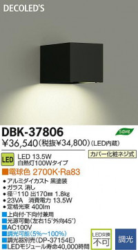 機能/他:■上向付・下向付兼用|■光源可動(左右15°外向45°)|■AC100V|■調光可能(5%〜100%)|■調光器別売(DP-37154E)|■LEDモジュール寿命40,000時間|23VA|消費電力 13.5W|定格光束 400lm|Ra83|DECOLED’S|SAVE