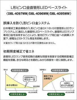 ■機能/他:■AC100〜242V|■調光可能(20%〜100%)|■調光器別売(DP-53392E・53393E)|■ランプ寿命40,000時間|注)配線施工の際、電源線以外に調光信号線(CPEVφ0.9〜1.2)が必要です。|32VA|消費電力 30W|定格光束 2380Lm|Ra84|DECOLED’S|箱型|初期照度補正型|SAVE