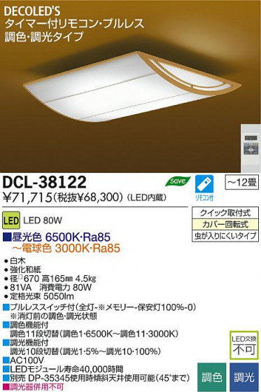 機能/他:■プルレススイッチ付(全灯-※メモリー-保安灯100%-0)| ※消灯前の調色・調光状態|■調色機能付| 調色11段切替(調色1・6500K〜調色11・3000K)|■調光機能付| 調光10段切替(調光1・5%〜調光10・100%)|■AC100V|■LEDモジュール寿命40,000時間|■別売 DP-35345使用時傾斜天井使用可能(45°まで)|■調光器併用不可|81VA|消費電力 80W|定格光束 5050lm|Ra85/Ra85|タイマー付リモコン・プルレス|調色・調光タイプ|DECOLED’S|SAVE