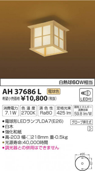 白熱球60W相当|●電球形LEDランプLDA7(E26)|●白木|●強化和紙|”●高-203 幅-□218mm 重-0.5kg”|●消費電力:7.1W|●色温度:2700K|●演色性:Ra80|”●定格光束:425 lm”|”●固有エネルギー消費効率:59.8 lm/W”|”●光源寿命:40,000時間”|●調光器との併用はできません