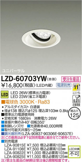 DAIKO 大光電機 LEDユニバーサルダウンライト LZD-60703YW