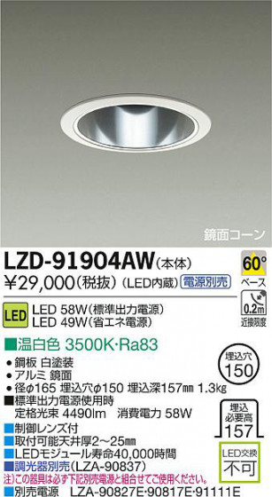 ■制御レンズ付|■取付可能天井厚2〜25mm|■LEDモジュール寿命40,000時間|■調光器別売(LZA-90837)|注)この器具は必ず下記別売電源と組合せてご使用ください。|■別売電源 LZA-90827E・90817E・91111E|■標準出力電源使用時 定格光束 4490lm 消費電力 58W|Ra83