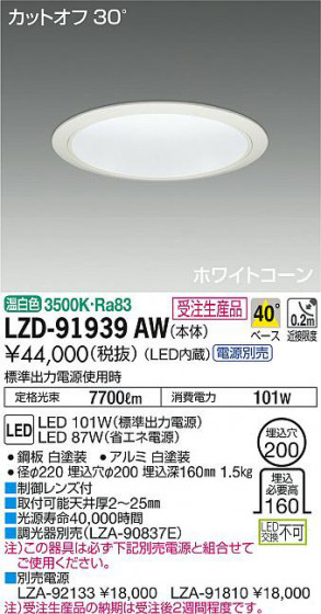 ■別売電源 LZA-92133 ¥18,000 LZA-91810 ¥18,000、注)受注生産品の納期は受注後2週間程度です。、標準出力電源使用時 定格光束 7700lm 消費電力 101W、Ra83