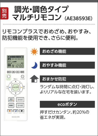 LED38.7W|●LED(電球色+昼光色)|●木製・ナチュラルウッド色|●アクリル・乳白色|●飾:プラスチック・ライトシルバー塗装|●壁スイッチ:全灯→シーン1→シーン2→LED保安灯|”●高-147 幅-φ632mm 重-2.8kg”|●消費電力:38.7W|●色温度:2700K〜6500K|●演色性:Ra82|”●定格光束:4,105 lm”|”●固有エネルギー消費効率:106.0 lm/W”|”●光源寿命:40,000時間”|●専用リモコン付|●調光範囲(100〜約1%)、LED保安灯5段階調光|●調色範囲(2700K〜6500K)|”●別売リモコン〔AE38593E ¥5,400(税抜)〕”|”●別売リモコン〔AE44865E ¥3,000(税抜)〕”|”●傾斜天井アダプタ対応型〔AE37490E別売 ¥5,800(税抜)〕”|●調色時定格光束値:2700K時(1970lm・19.4W)/6500K時(2135lm・19.4W) 〜8畳