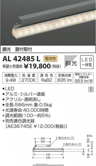 LED9.4W|●LED|●アルミ・シルバー塗装|●アクリル・透明消し|”●高-40 幅-26 全長-586mm 重-0.5kg”|●消費電力:9.4W|●色温度:2700K|●演色性:Ra82|”●定格光束:835 lm”|”●固有エネルギー消費効率:88.8 lm/W”|”●光源寿命:40,000時間”|●調光範囲(100〜約5%)|”●別売適合調光器〔AE36745E ¥12,000(税抜)〕”
