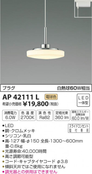 白熱球60W相当|●LED|●鋼・クロムメッキ|●シリコン・乳白|”●高-127 幅-φ150 全長-1300〜600mm 重-0.6kg”|●消費電力:6.0W|●色温度:2700K|●演色性:Ra82|”●定格光束:360 lm”|”●固有エネルギー消費効率:60.0 lm/W”|”●光源寿命:40,000時間”|●高さ調節可能型|”●コード・キャブタイヤコード φ3.8”|●傾斜天井ではご使用になれません|●調光器との併用はできません