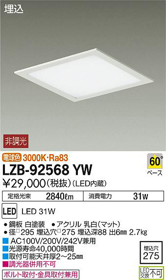 DAIKO 大光電機 埋込ベースライト LZB-92568YW