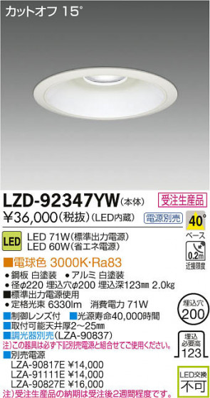 ■制御レンズ付|■光源寿命40,000時間|■取付可能天井厚2〜25mm|■調光器別売(LZA-90837)|注)この器具は必ず下記別売電源と組合せてご使用ください。|■別売電源 LZA-90817E ¥14,000 LZA-91111E ¥14,000 LZA-90827E ¥16,000|注)受注生産品の納期は受注後2週間程度です。|■標準出力電源使用時 定格光束 6330lm 消費電力 71W|Ra83