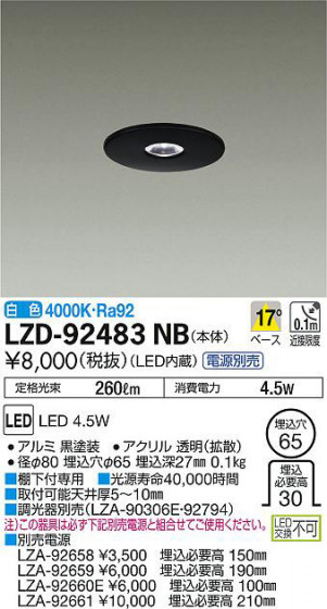 ■別売電源 LZA-92658 ¥3,500 埋込必要高 150mm LZA-92659 ¥6,000 埋込必要高 190mm LZA-92660E ¥6,000 埋込必要高 100mm LZA-92661 ¥10,000 埋込必要高 210mm、定格光束 260lm 消費電力 4.5W、Ra92